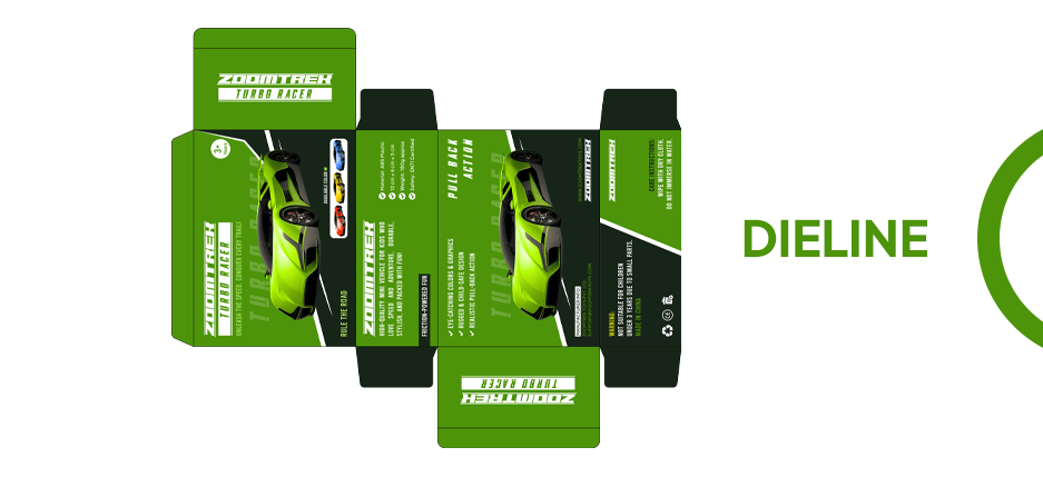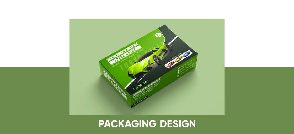 Dynamic and creative packaging design concept for ZoomTrek Turbo Racer, a high-speed toy car aimed at kids aged 3 and above.