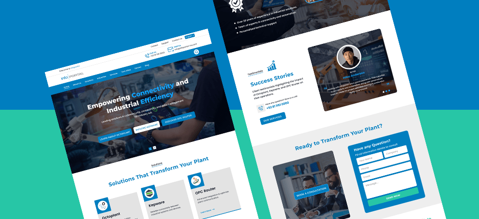 A professional website UI/UX design concept for InfoPortal, a company providing industrial and connectivity solutions. The layout demonstrates a modern, trustworthy aesthetic featuring structured grids, bold typography, and clear calls-to-action. The design emphasizes accessibility, simplicity, and digital precision to create a user-friendly interface for business clients in Industry 4.0. With a sleek blue color palette and visual hierarchy optimized for conversion, this project showcases expertise in front-end web design, responsive layout creation, and corporate branding for technology-driven enterprises.