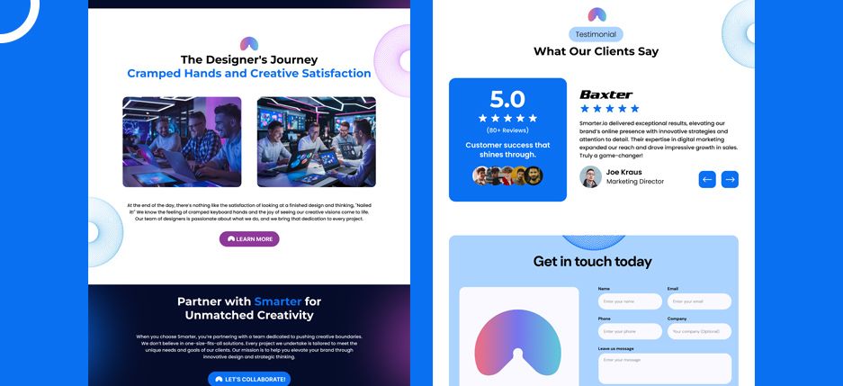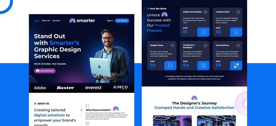 My approach centered on user experience optimization and design consistency. Beginning with wireframes, I defined clear navigation pathways to support quick understanding and intuitive exploration. A modular grid system ensured scalability and ease of maintenance for future updates. Color psychology guided the palette—blue for trust, white for clarity, and gradient accents for energy. Typography was carefully chosen to balance professionalism with readability. Using Figma and Photoshop, I composed responsive layouts with smooth visual flow. The final design communicates authority, creativity, and digital precision, aligning perfectly with the brand’s promise of working “Smarter, not harder.”